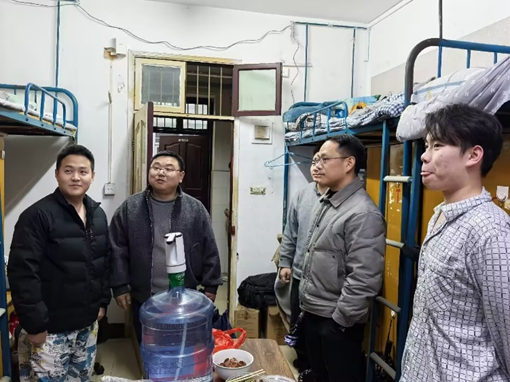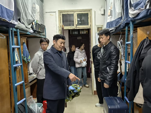 走访过程中,老师们重点对宿舍内违规使用大功率电器、私拉乱接电线等安全隐患进行了细致排查,逐一核对住宿信息,严查私自校外租房行为,确保宿舍管理制度落到实处。同时,老师们细致询问同学们的假期生活、返校适应情况及新学期的学习规划,耐心倾听大家在学习、生活中遇到的困难,并给予针对性建议。戴文华院长亲切叮嘱同学们,要时刻绷紧安全这根弦,自觉遵守学校宿舍管理规定,切实注意用电、防火安全;舍友之间要互相关心、互相提醒,共同营造安全、整洁、文明的住宿环境;同时要保持宿舍通风和个人卫生,以健康饱满的身心状态投入到新学期的学习和生活中。