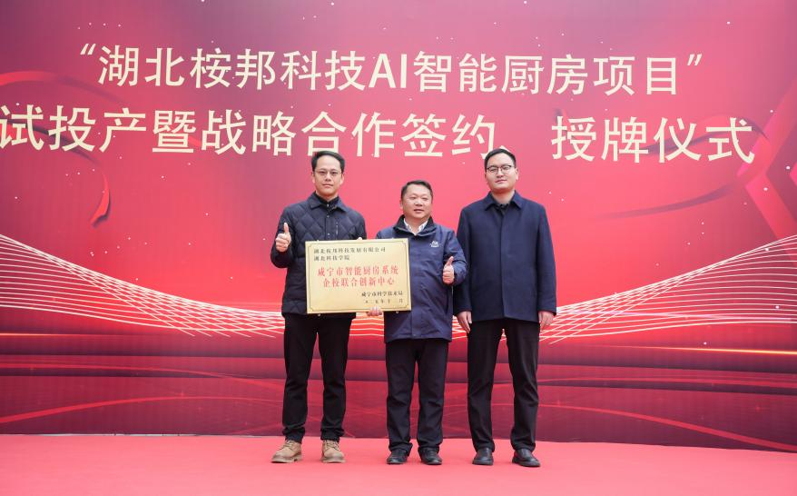 仪式上,在通城县副县长韩旭辉同志的见证下,bbin连环夺宝官网与桉邦科技共同揭牌成立“咸宁市智能厨房系统企校联合创新中心”。该中心旨在以AI智能厨房系统为主攻方向,整合学院在自动化、机械工程、智能控制、材料科学等领域的学科优势与企业实战经验,共同开展智能烹饪设备研发、物联网控制系统优化、自动化流程创新等关键技术的协同攻关。